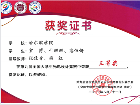 2021年7月24日至25日,第九届全国大学生光电设计竞赛东北区赛暨第五届东北地区大学生光电设计竞赛在哈尔滨工业大学举行,经过激烈角逐,我院物理学专业学生贺博、付醒醒、寇恒妍获得晋级国赛资格,并在2021年8月由深圳大学承办的全国第九届大学生光电设计竞赛中获得三等奖。