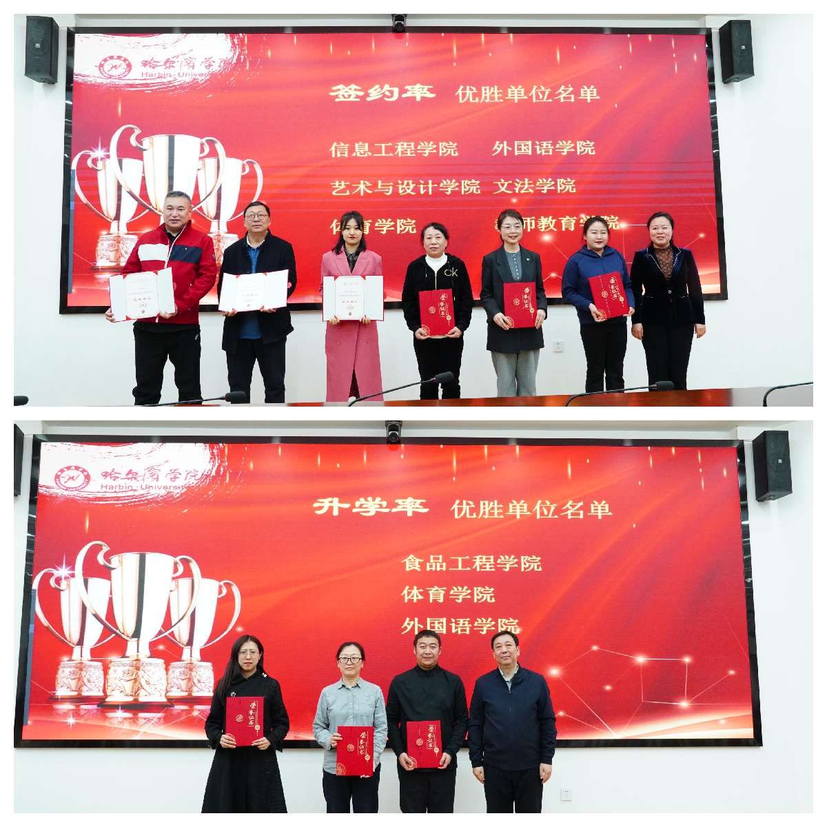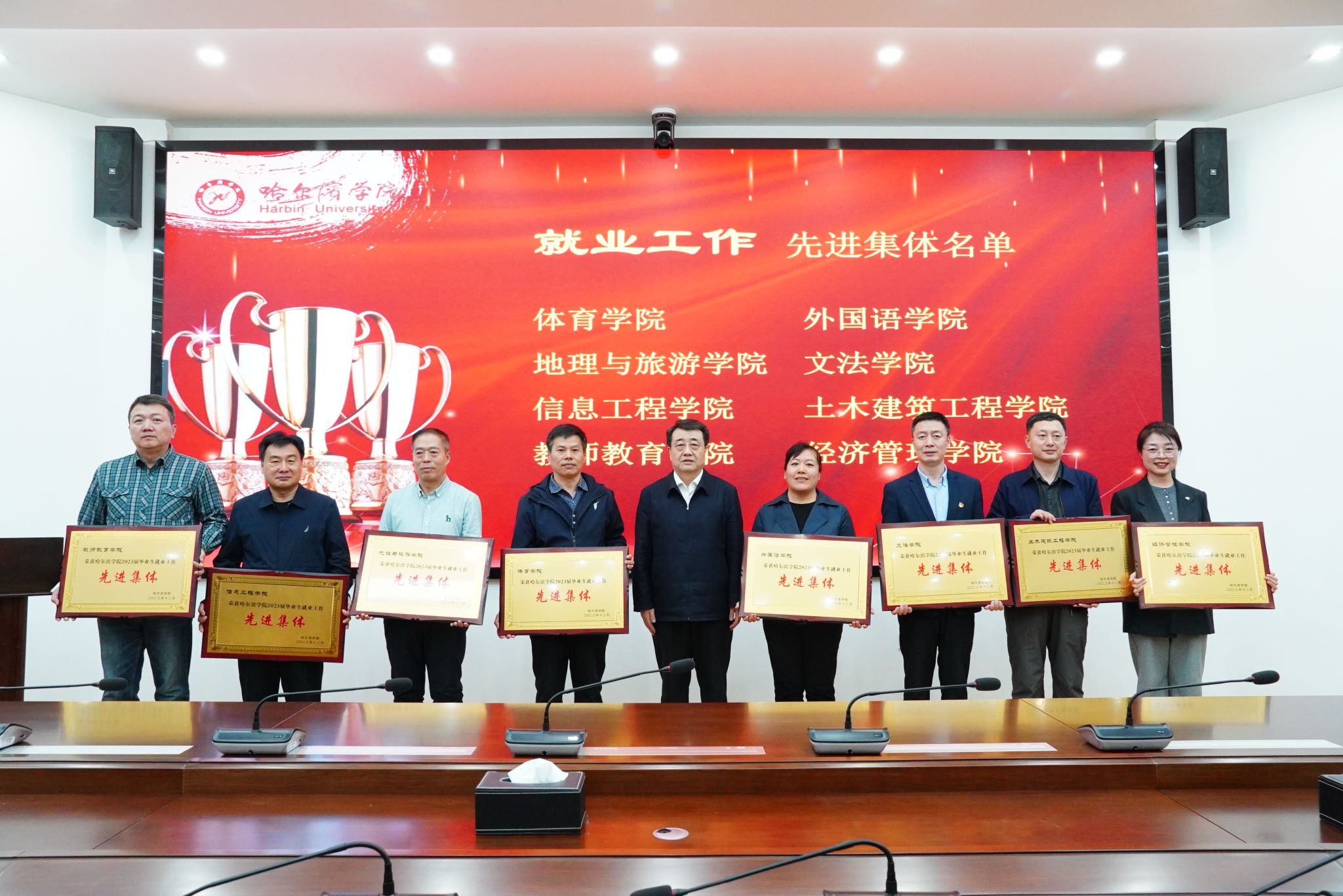 体育学院、外国语学院、教师教育学院、经济管理学院在会议上作交流发言。校领导分别向荣获“2023年就业工作绩效奖励”“2023届毕业生就业工作先进个人”“2023届毕业生升学优胜单位”“2023届毕业生签约优胜单位”及“2022届毕业生就业工作先进集体”的单位和个人颁发奖状和证书。