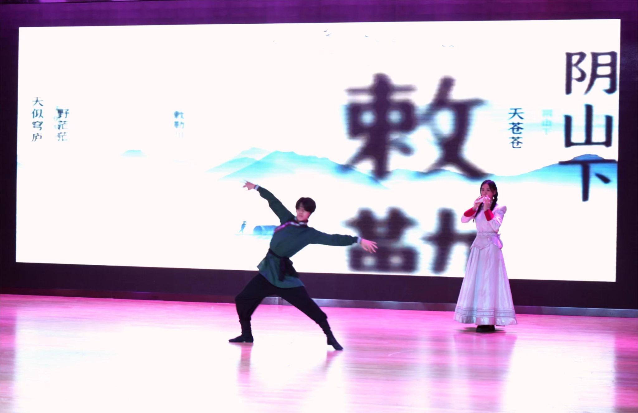第二部分舞台编创的作品有,女声三重唱《敕勒歌》、竹笛二重奏《小河淌水》、男女声二重唱《想亲亲》、男声三重唱《春花秋月何时了》,学生们以重唱、重奏、舞台剧等形式,尝试将传统与现代、民族与流行、歌舞乐多元文化融合编创,以年轻人的视角诠释了新时代的文化传承。