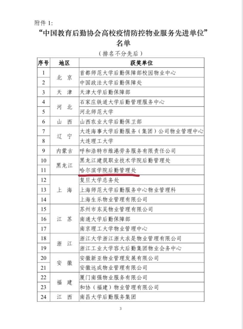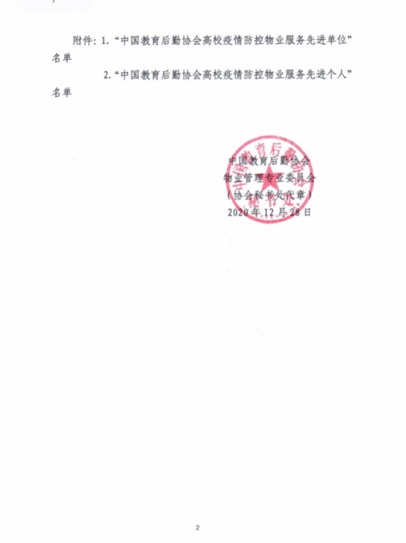 2020年12月28日,“中国教育后勤协会高校疫情防控物业服务先进单位、先进个人”评选结果揭晓,我校被授予“中国教育后勤协会高校疫情防控物业服务先进单位”称号,成为黑龙江省获此殊荣的两所高校之一。