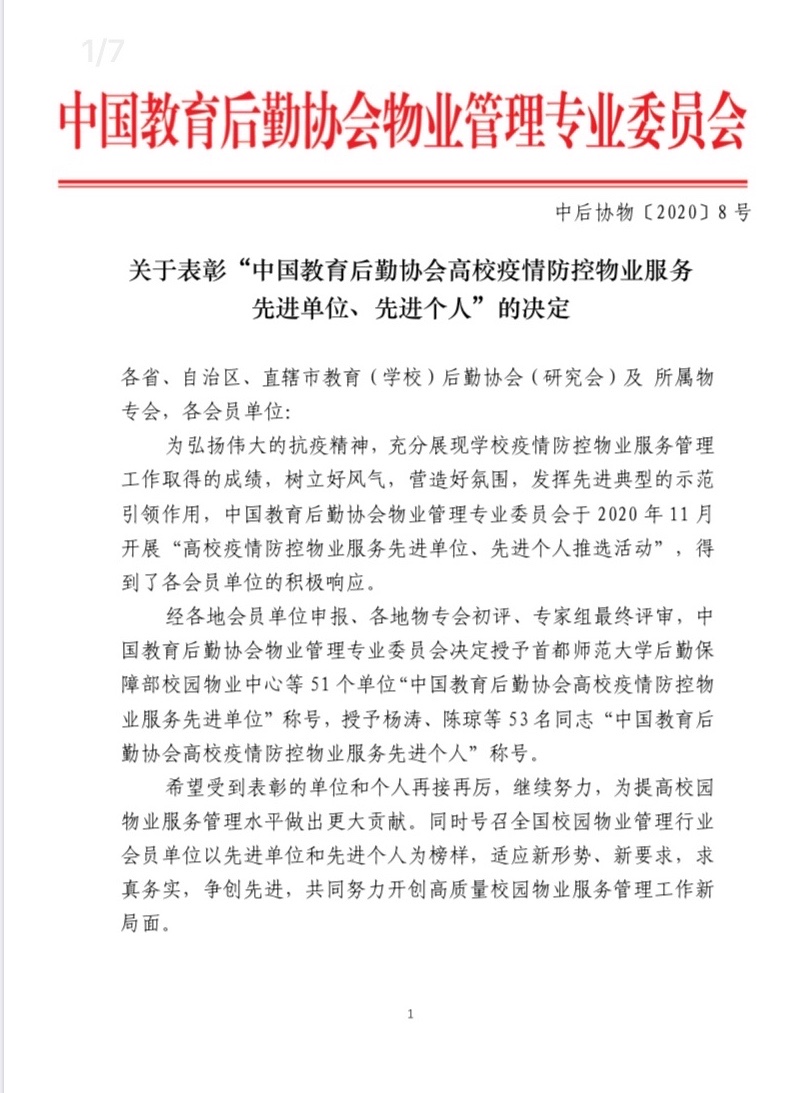 “中国教育后勤协会高校疫情防控物业服务先进单位、先进个人”评选是中国教育后勤协会物业管理专业委员会为弘扬伟大抗疫精神、充分展现学校疫情防控物业服务管理工作取得的成绩,发挥先进典型的示范引领作用,于2020年11月启动的评选,共计评选出先进单位51家及先进个人53人。