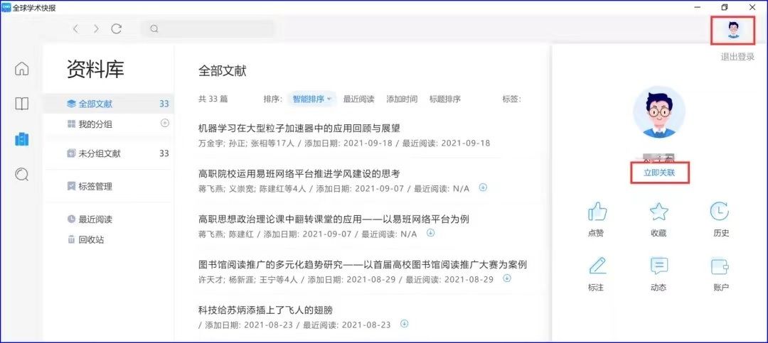 步骤3:电脑端下载安装并成功登录全球学术快报桌面端后,点击右上角头像,在跳出的界面点击“立即关联”。