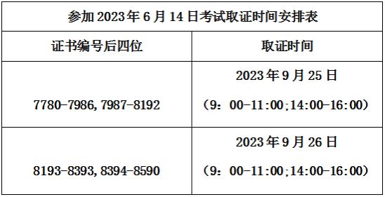请各位考生严格按照上表通知时间段内领取,领取时请提前说出证书编号后四位以便查找,并携带本人身份证,异地考生他人代取请携带考生本人身份证复印件及代取人身份证。