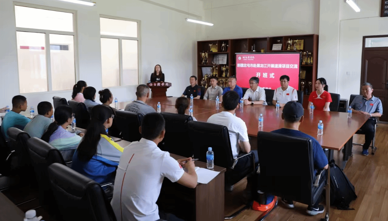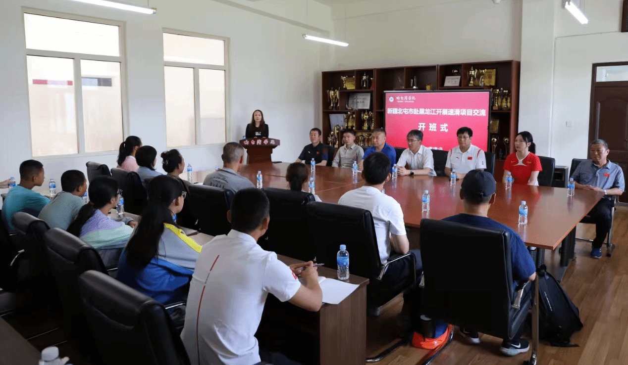 7月1日上午,“新疆北屯市赴黑龙江开展速滑项目交流”开班仪式在体育学院会议室举行,新疆北屯市文体旅局副局长郭润龙、黑龙江省冰雪产业研究院院长张贵海、哈尔滨学院体育学院及现代体育产业学院院长戴显岩、副院长任彦军、哈尔滨学院现代体育产业学院副院长刘博朗、短道速滑世界冠军李文文出席会议,体育学院相关教师及新疆北屯市相关师生参加会议,会议由黑龙江省冰雪产业研究院副院长李松梅主持。
