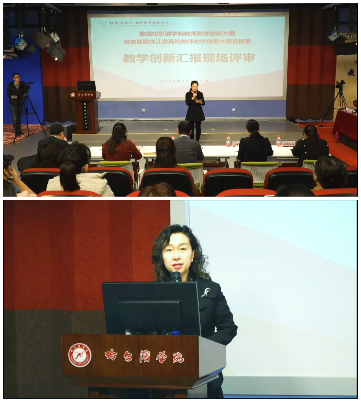 按照教育部、省教育厅关于举办高校教师教学创新大赛的通知要求,在学校领导的支持和指导下,教师教学发展中心协同相关职能部门和二级教学单位积极举办“首届哈尔滨学院教师教学创新大赛暨首届黑龙江省高校教师教学创新大赛选拔赛”(以下简称“大赛”)。大赛于2020年11月18日开启,期间经过了二级教学单位初赛和决赛网络评审等环节。12月24日下午,大赛决赛的教学创新设计汇报现场评审在哈尔滨学院多功能电视演播厅举行,经由初赛推选出来的13位参赛教师(团队)在此一展教学风采,校工会主席陈威、部分二级学院领导和教师百余人参加了现场观摩。比赛由教师教学发展中心副主任马洪丽主持,现代教育技术中心、网络管理中心和黑龙江省鑫隆科技有限公司提供场地、设备和在线技术支持,超星平台对全程进行网络直播。