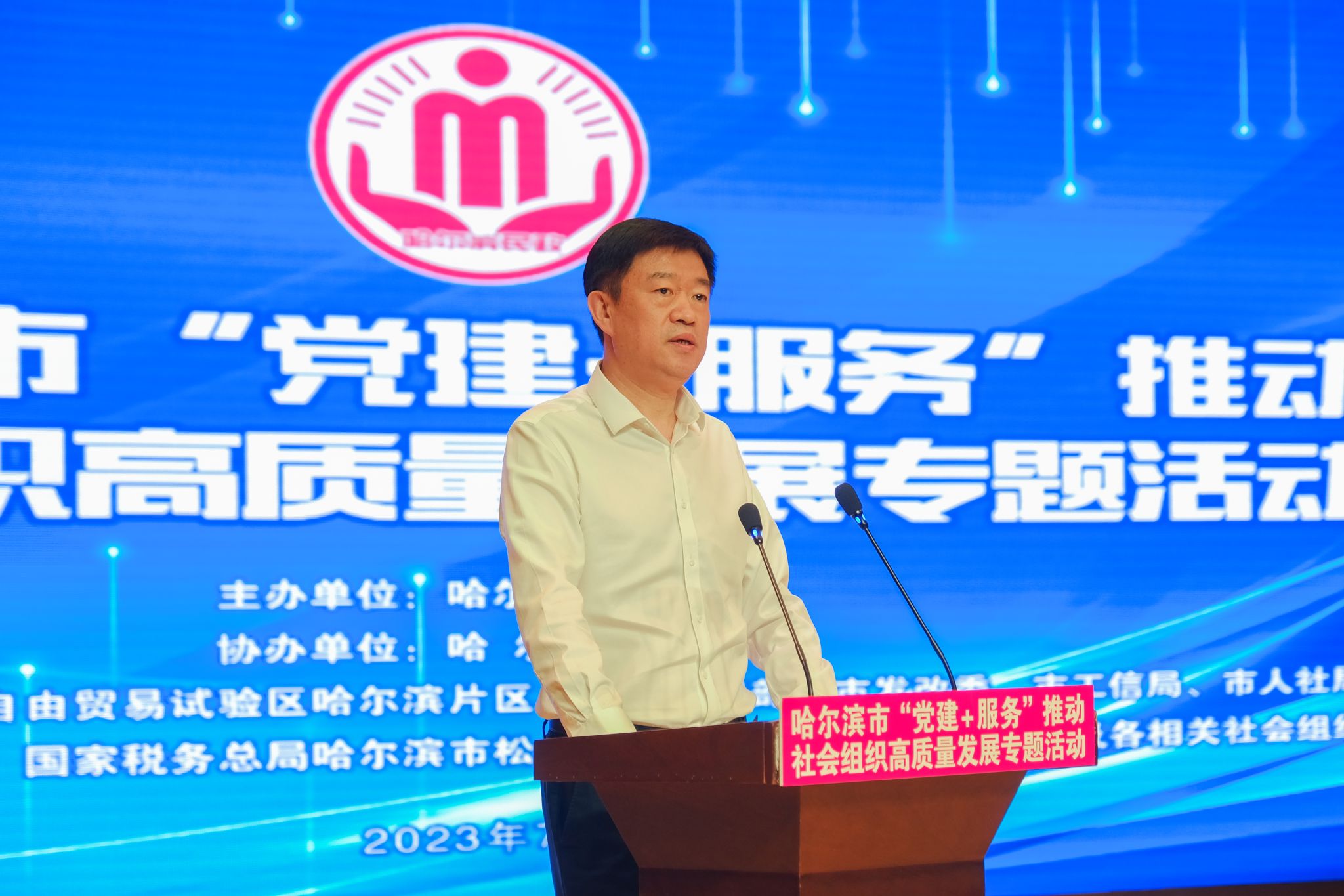 7月7日上午8:30哈尔滨市“党建+服务”推动社会组织高质量发展专题活动在我校召开,活动由哈尔滨市民政局主办,学校继续教育学院协办。市民政局党组书记、局长锡东升、副局长丁庆海,市投资服务局二级巡视员陈树森,我校纪委书记马弘莉出席会议。来自哈尔滨市的社会组织包括商会、学会、协会、民办学校百余家单位、200余人参加本次活动。