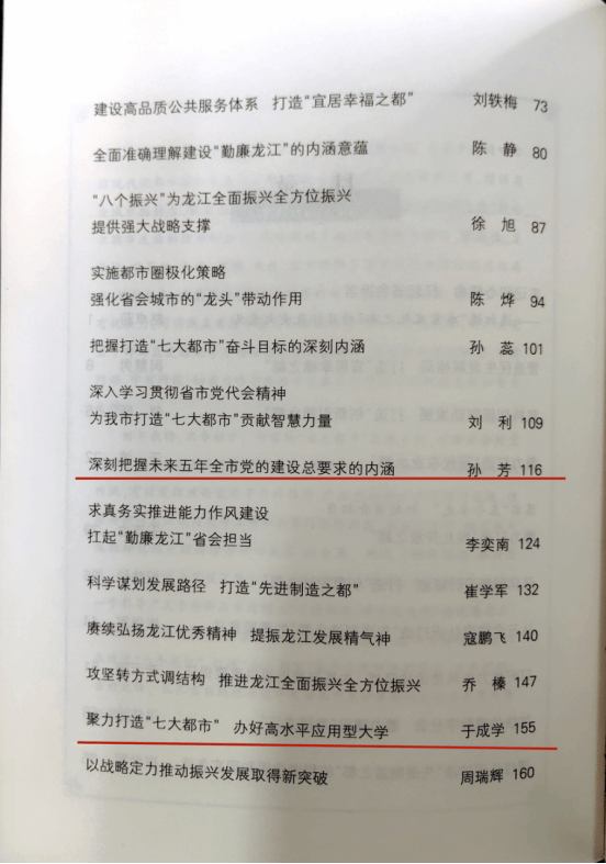 我校被收录三篇文章分别为校长、党委副书记于成学教授的《聚力打造“七大都市” 办好高水平应用型大学》,马克思主义学院党总支书记、院长孙芳副教授的《深刻把握未来五年全市党的建设总要求的内涵》,艺术与设计学院祝劲松副教授的《强化创意设计赋能 打造“创意设计之都”》。三篇文章从不同角度对构建新发展格局、实现高质量发展进行了深刻理论阐释,为哈尔滨振兴发展提供了理论支撑和智力支撑。