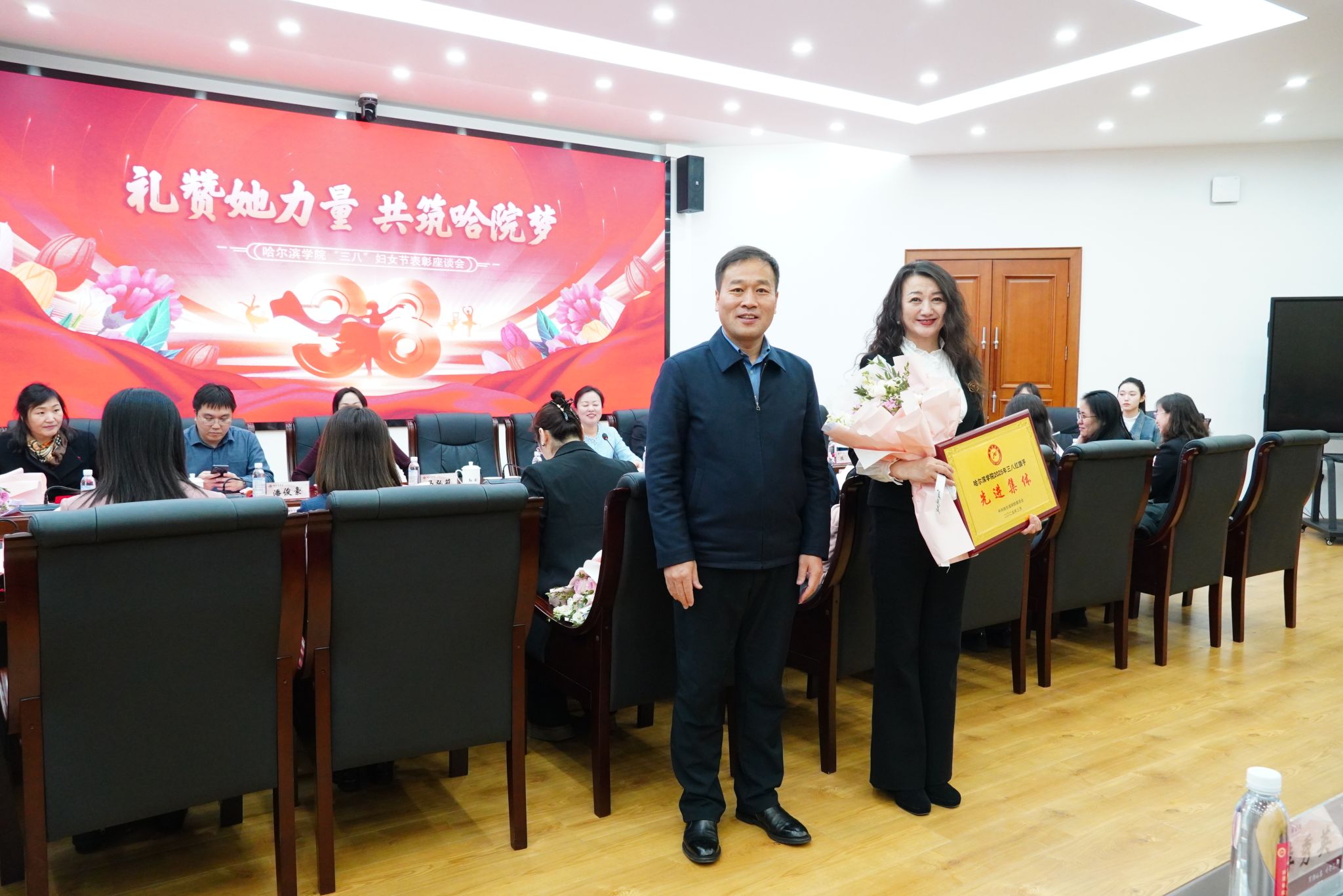 3月7日下午,学校在党政办公楼404会议室召开“礼赞她力量,共筑哈院梦”纪念“三八”妇女节表彰座谈会。党委书记孙钊出席座谈会并讲话,纪委书记马弘莉,副校长吴旭峰、院长助理潘俊豪出席会议。机关处室处(部)长,二级学院书记、院长,受表彰单位和教师代表参加会议。座谈会由党委副书记、工会主席李娜主持。