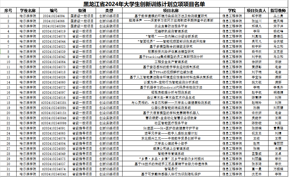 在黑龙江省教育厅公布的2024年度“黑龙江省大学生创新创业训练计划项目立项”中,信息工程学院共获批国家级项目3项,省级项目29项,创近年来信息工程学院在大学生创新创业训练项目省级以上立项的最好成绩。我院师生团队以高度的热情和专业精神,在信工学院创新创业基地的支持下,围绕专业、创新对项目进行深度打磨,这些项目不仅彰显了我院师生扎实的专业基础和卓越的创新能力,更充分展现了学生们面向经济社会发展需求,勇于探索未知、敢于实践尝试的精神风貌。通过充分发挥大学生创新创业训练计划项目的育人作用,我院鼓励并带动学生积极投身于科学研究与创新实践之中,开展丰富多彩的实践创新活动。