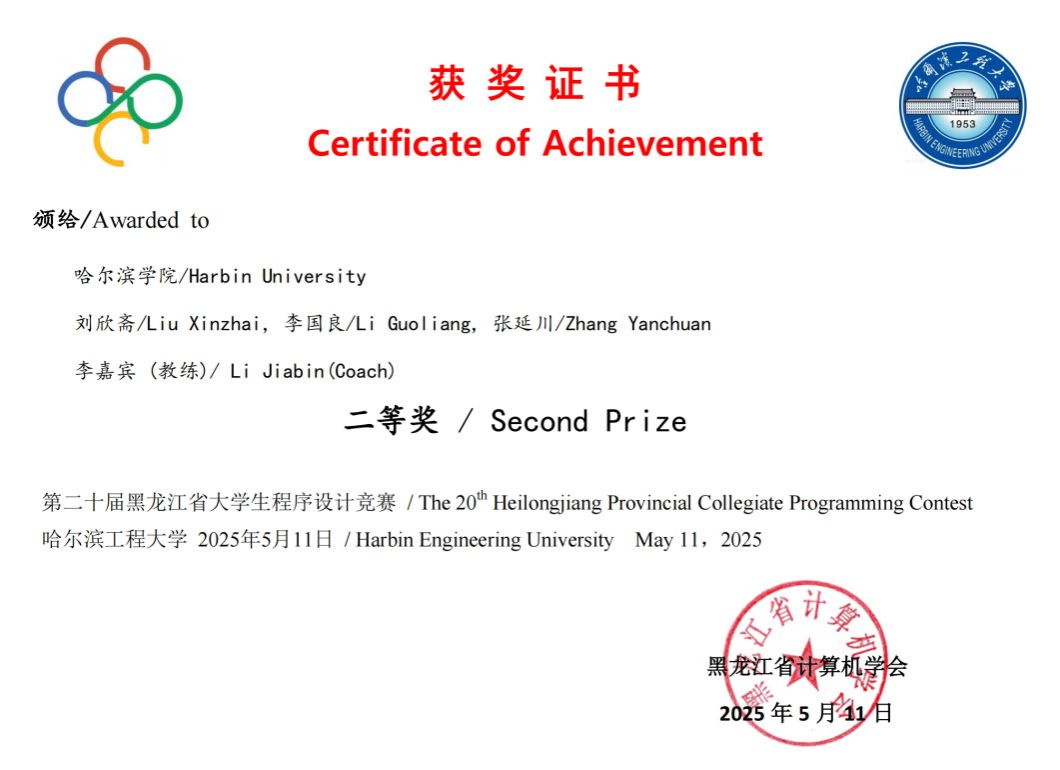 黑龙江省大学生程序设计竞赛是极富影响力的大学生程序设计竞赛,在发现和培养优秀计算机人才方面起到了举足轻重的作用。此项赛事将有助于我院学生实践素质的培养,提高我院学生解决实际问题的能力,在小组合作的模式下,锻炼学生创造力、分析能力、团队沟通协作能力等,旨在培养创新型、应用型人才。通过参赛不仅增进了与其他院校的交流,更为接下来我院在ICPC和CCPC赛事中取得更优异的成绩打下了坚实基础。