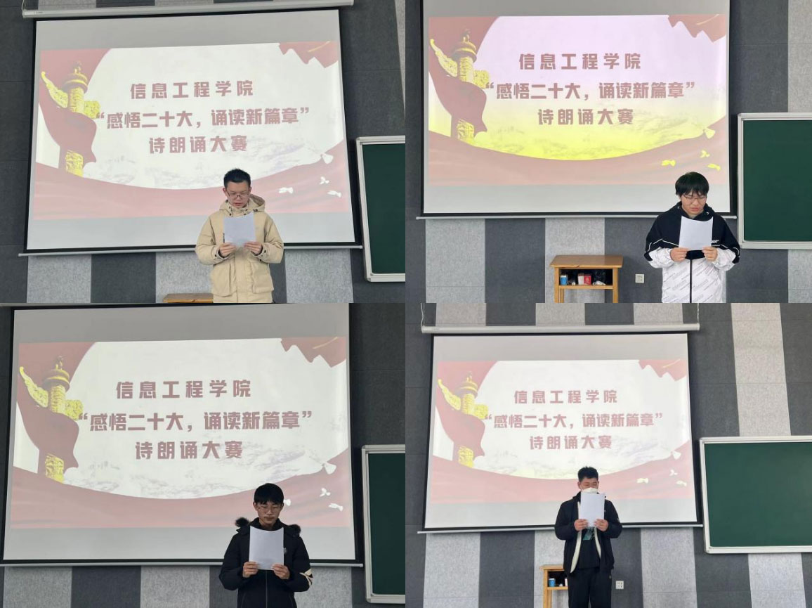 为弘扬党的二十大精神与社会主义核心价值观,让我院学生更深入理解与感悟时代信念,培养我院学生的爱国主义精神,做好属于新时代的新青年,信息工程学院(软件学院)于11月2日组织开展“感悟二十大诵读新篇章”二十大诗朗诵预赛,本次比赛充分展现了时代新青年的风采,使处于静默期间的学校更加活跃、更加充满蓬勃的生机。