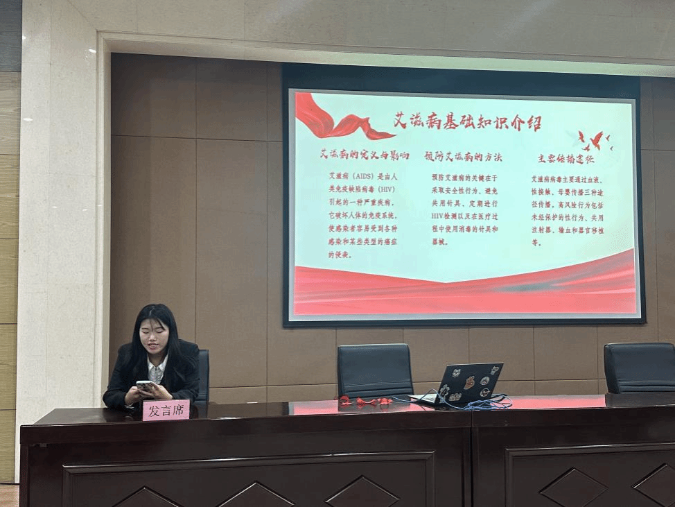 项目负责人校青年志愿者协会主席董思雨做项目介绍。她对红丝带项目进行了简单介绍,讲解了艾滋病的传播途径及危害,并为提供了几种简单、有效的预防艾滋病的科学方法。呼吁广大青年学生“共抗艾滋,共享健康”,呼吁同学们树立正确观念,积极预防,消除歧视,带动身边人一同为防艾努力,让健康生活理念在校园传播,助力全社会防艾氛围的营造。