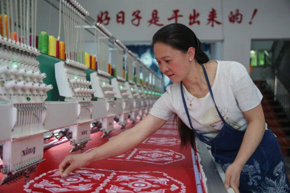 30多年来,统一战线发挥人才荟萃、智力密集、联系广泛的优势,全方位、立体化、多层次参与贵州省毕节试验区建设,助推打赢脱贫攻坚战和全面建成小康社会。图为毕节市“绣娘”在统一战线帮扶成立的刺绣加工车间内工作。中央统战部供图