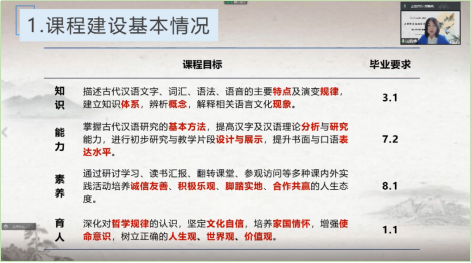 《古代汉语》课程是汉语言文学、汉语国际教育专业的基础课,在教学改革中课程始终紧跟专业培养目标,回应时代发展,聚焦社会需求,形成了“以古鉴今、修身致远”的教学理念,在改进教学目标、优化教学内容、丰富教学资源、创新教学方法、完善评价考核、教学团队建设等方面均作出了有益尝试,2021年被认定为第二批黑龙江省线下“一流课程”。