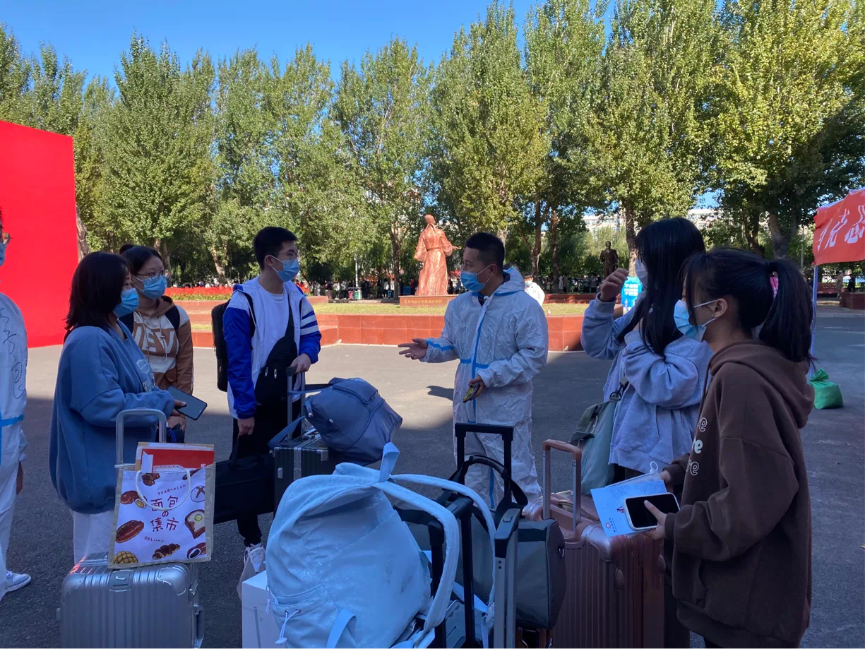 新生通过严格测量体温、核对核酸检测结果、检查行程码和健康码、进行行李消杀和核酸检测后进入校园,前往我院迎新现场由我院迎新志愿者帮助搬运行李,乘坐摆渡车前往所在公寓楼并完成登记,确保新生顺利入住寝室。从进入校园到走下摆渡车,热烈的迎新气氛扑面而来:迎新喷绘和充气彩虹门上写着热情洋溢的欢迎词,学长、学姐们手中高高举起的指示牌展示着关心关爱,化解了大家初入校园的拘谨与陌生。