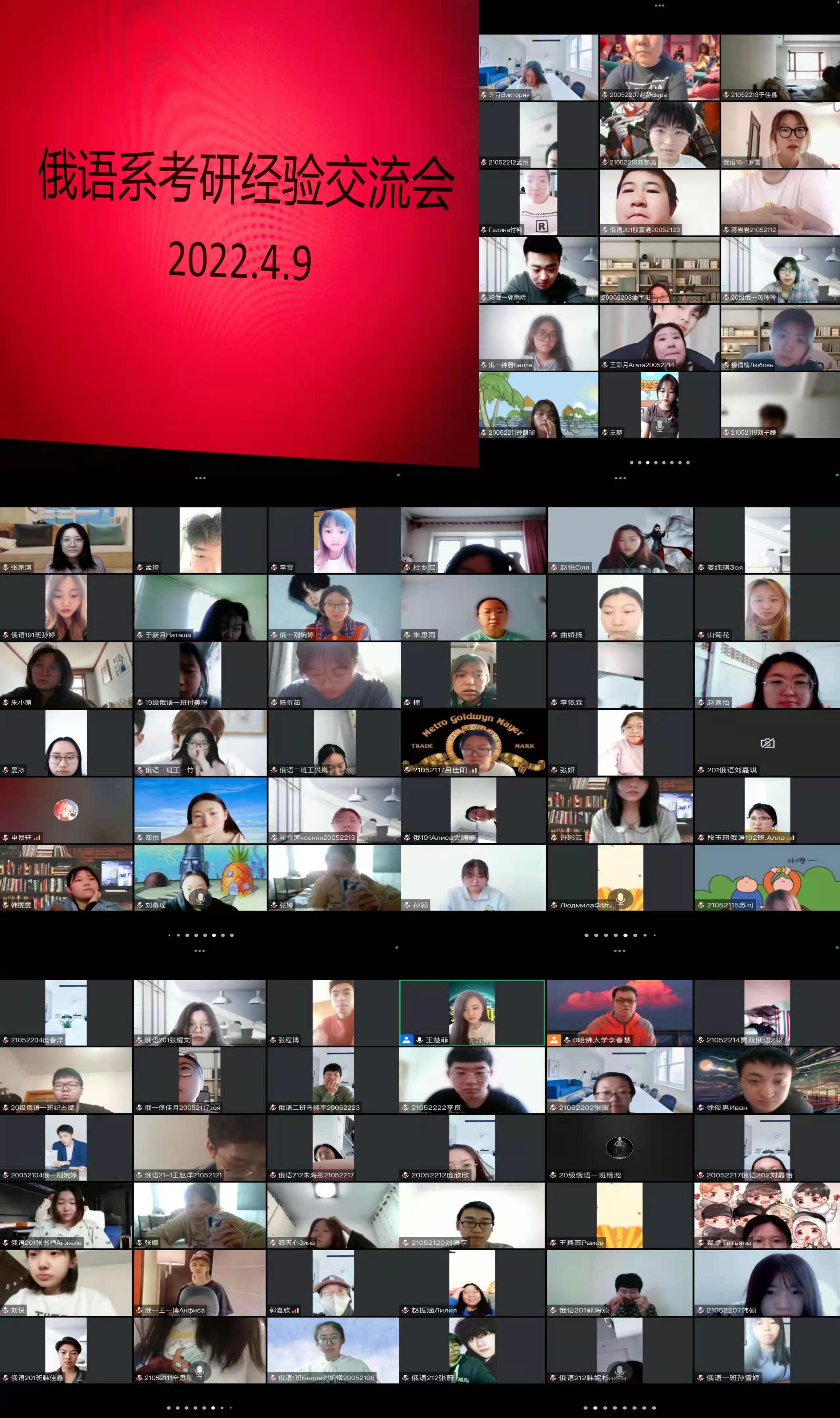 2022年4月9日16时,俄语系考研经验交流会在线上举行。俄语系2018级通过研究生复试拟录取的7名同学为2019级、2020级、2021级的同学分享了考研经验。外国语学院学生会学习部长、俄语系192班王楚菲同学主持考研经验交流会。