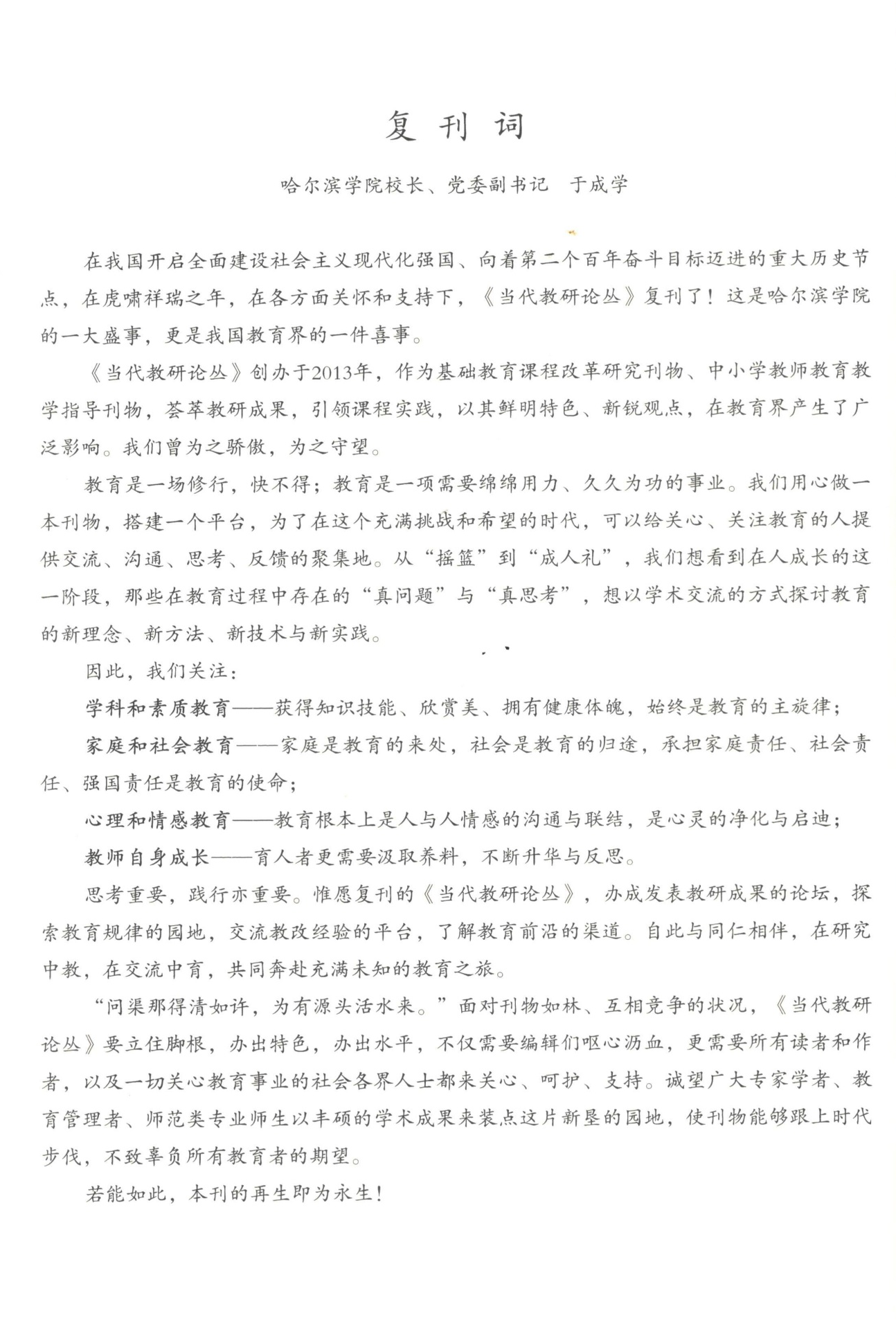 在我国开启全面建设社会主义现代化强国、向着第二个百年奋斗目标迈进的重大历史节点,在虎啸祥瑞之年,在各方面关怀和支持下,《当代教研论丛》复刊了!这是哈尔滨学院的一大盛事,更是我国教育界的一件喜事。