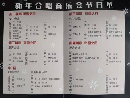 为迎接2020年新年的到来,丰富校园文化,推动学风建设,彰显我校学生精神风貌,向关心支持学校发展的学校同仁、在校学生及各界人士致以最真挚的新年祝福,音乐与舞蹈学院将举行“雪落的声音”新年合唱音乐会。