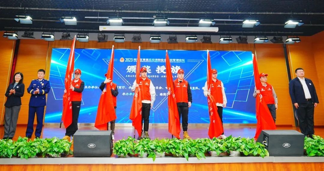 校团委、保卫处相关负责同志线下参会。保卫处防火科孙岩代表校青年志愿者代表登台接受省教育厅、团市委、市消防支援支队领导授予的“青年消防志愿者”旗帜。保卫处副处长揣志强代表学校接受南岗消防救援大队捐赠的志愿者服装。