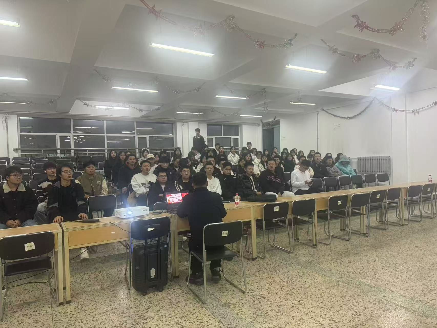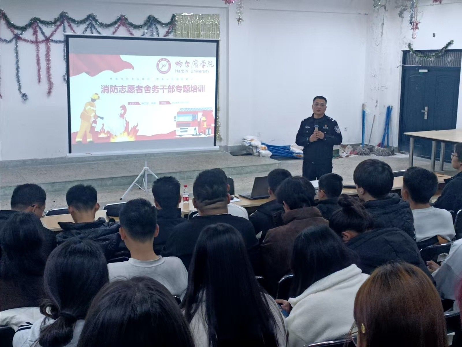 培训活动开始前,与会师生首先观看了“校园消防安全警示教育片”。而后,由保卫处消防科孙岩针对消防安全理论常识、高校典型火灾案例、我校近年来发生过的安全隐患、学生公寓需高度关注的隐患问题等内容作细致讲解。