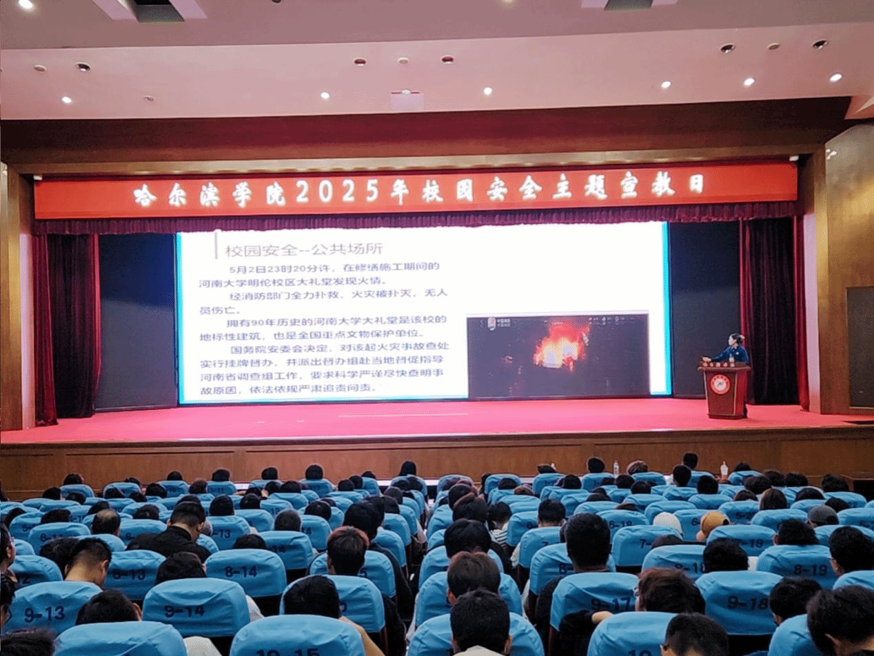 9月19日下午,作为“校园安全主题宣教日”系列活动第三场报告会在图书馆报告厅隆重举行。哈尔滨学院党委副书记李娜、保卫处处长李家强、副处长揣志强、教务处副处长郭海龙、哈尔滨市南岗区消防救援大队监督员宁欣及消防科相关工作人员,2025级新生代表800余人参加此次活动。