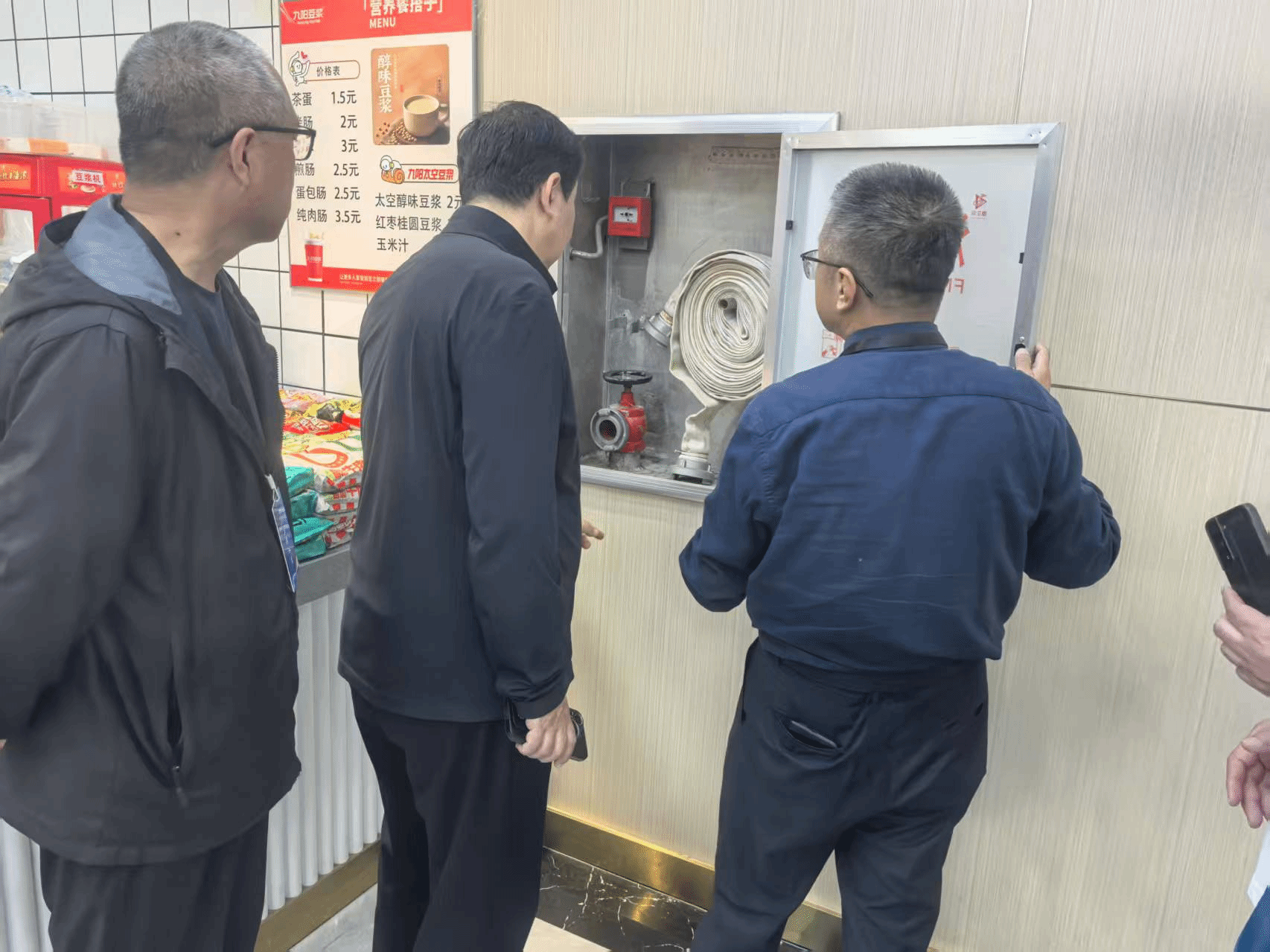 孙红镱一行先后前往学生公寓、学生食堂及图书馆,实地检查消防安全、食品安全、燃气安全及宿舍管理等方面工作。检查过程中,孙红镱详细了解假期期间学生宿舍的工作安排,走进男生寝室与同学们亲切交流,叮嘱大家假期外出务必遵守规章制度,增强安全意识,做好个人防护。在茉莉餐厅,他重点检查了消防设施的运行状况及食品卫生安全管理情况;在图书馆,孙红镱听取了负责人关于国庆假期工作安排的汇报,巡视了新安装的消防设备,对其预期效果表示肯定。