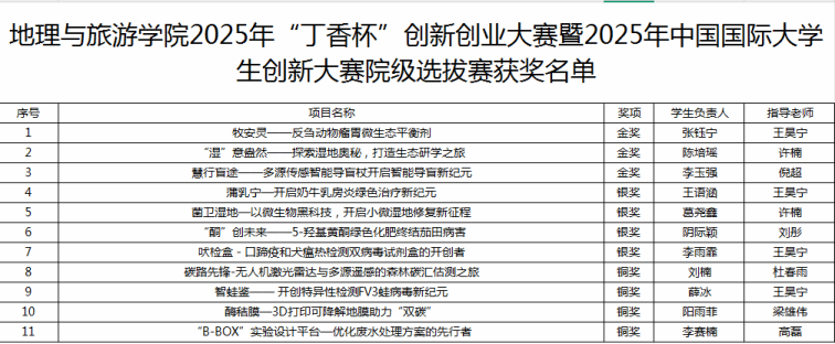 (文/刘彤)为全力备战2025年中国国际大学生创新大赛,地理与旅游学院于2025年5月26日18:00,在2号楼2602教室拉开了2025年“丁香杯”创新创业大赛暨中国国际大学生创新大赛院级选拔赛的帷幕。本次赛事以“我敢闯,我会创”为主题,本次大赛共有16支队伍团队参赛。食品工程学院食品系教师郑苗苗、化学系教师阎慧君、地理信息科学专业教师许楠、旅游管理专业教师尹英杰、创新创业辅导员刘彤担任此次比赛的评委,地理与旅游学院副院长孟令波及学生代表200余人在现场观摩比赛。