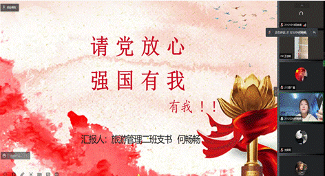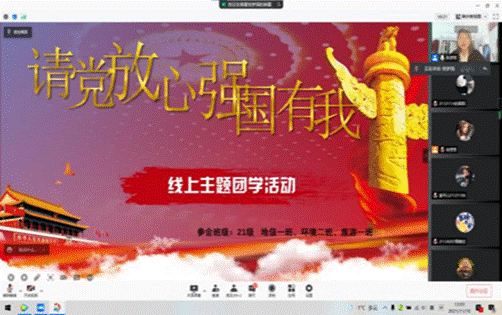 为认真学习贯彻习近平总书记“七一”重要讲话精神,积极践行“请党放心,强国有我”的青春誓言,引导团员青年把青春奋斗融入党和人民事业,努力成为实现中华民族伟大复兴的先锋力量,2021年11月10日至12日地理与旅游学院在全院范围内集中开展“请党放心,强国有我”线上主题团日活动。出席本次活动的嘉宾有院学生会主席孙野、副主席赵莹莹、全体2021级学生。此次团日活动分为五个环节,分别为唱团歌,支书讲解,读书分享,朗诵,全体宣誓,由学联部部长张梦园主持。