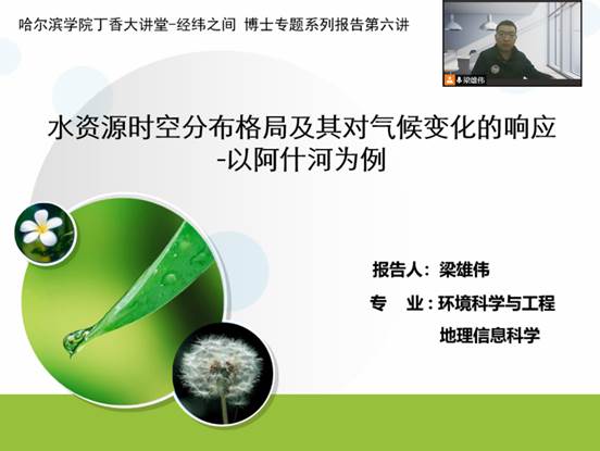 为加强教师相互交流学习,同时为学生体验科学研究,体会科研思维创造浓厚的氛围,地理与旅游学院于2021年12月1日下午在线上开展了“丁香大讲堂—博士专题系列报告”活动。此次报告为第六讲,由科技处及地理与旅游学院共同主办。报告由地理与旅游学院青年教师梁雄伟博士主讲,主题为“水资源时空分布格局及其对气候变化的响应-以阿什河为例”。地理与旅游学院专业教师、环境生态工程和地理信息科学专业学生共计206人参加此次报告。受郭红院长委托,孟博老师主持了此次报告会。