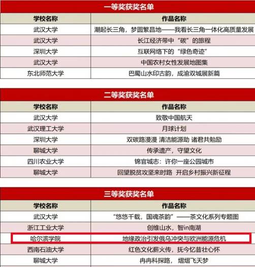 SuperMap杯高校GIS大赛是中国最早开设的GIS赛事,大赛每年都吸引200多所高校近万名学子参赛,得到各大高校师生、GIS专家学者和众多GIS业内人士的广泛关注,已成为GIS专业人才竞技的重要舞台。本届大赛主题为“20,当燃不凡”,制图组有近500个团队提交作品,最终评选出70支参赛队伍获得奖项。其中有5个参赛团队获得一等奖,6个参赛团队获得二等奖,22个参赛团队获得三等奖,37个参赛团队获得优胜奖。以下为获奖名单的部分团队。