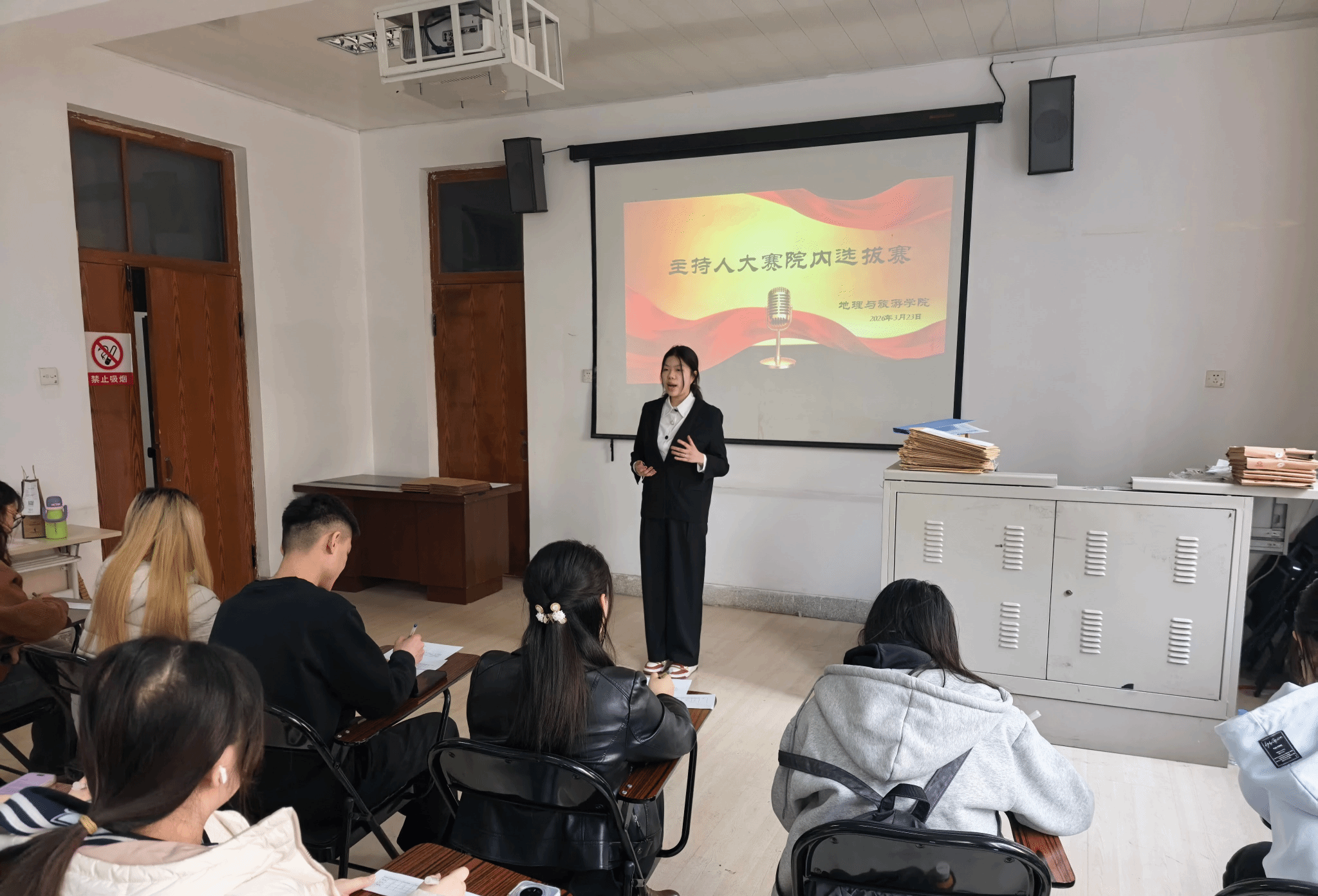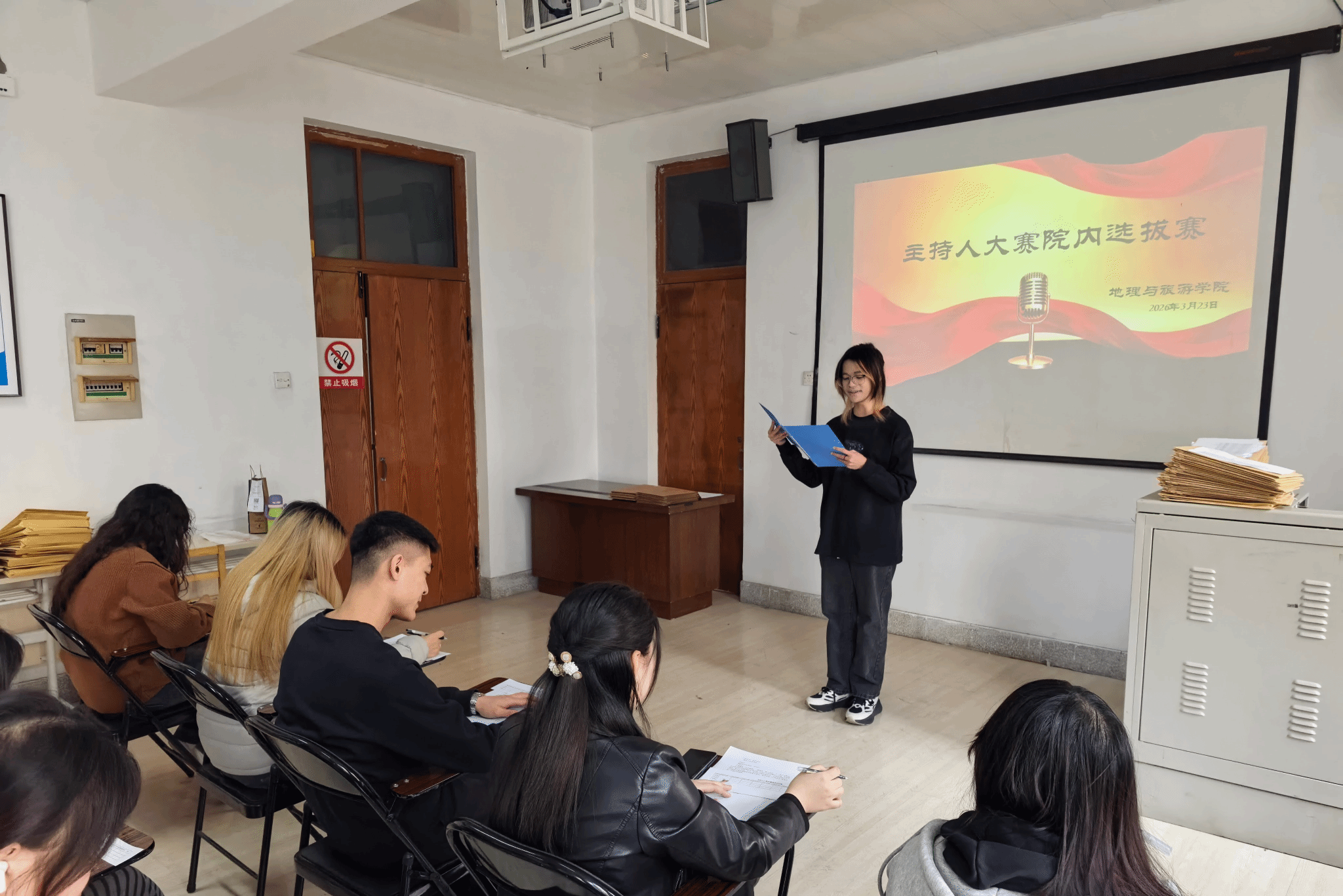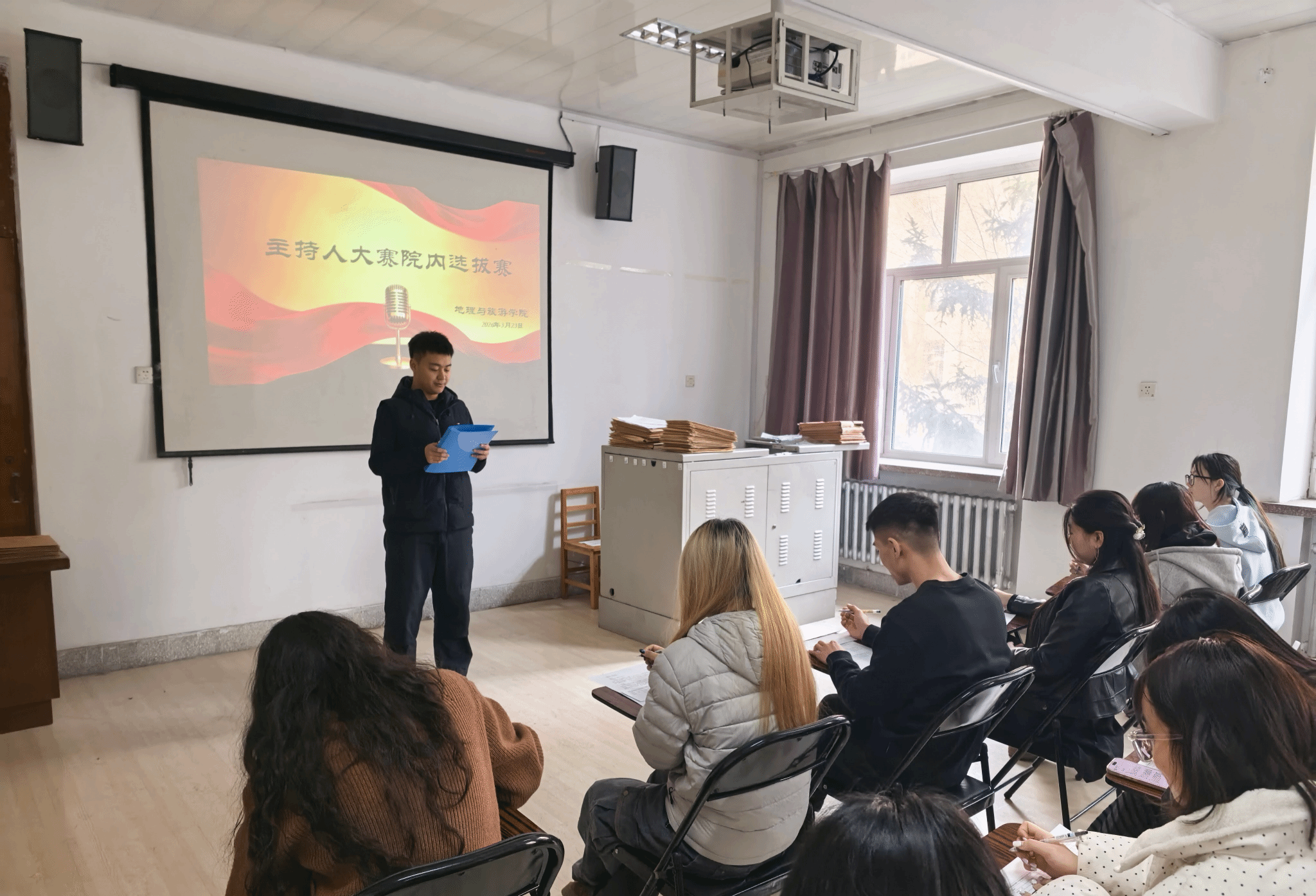 (文/杨立东)为进一步提升学生语言表达能力与舞台应变素养,发掘校园优秀主持人才,丰富校园文化内涵,地理与旅游学院于2026年3月23日在1251教室成功举办主持人大赛院内选拔赛。