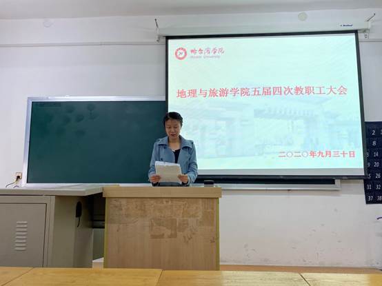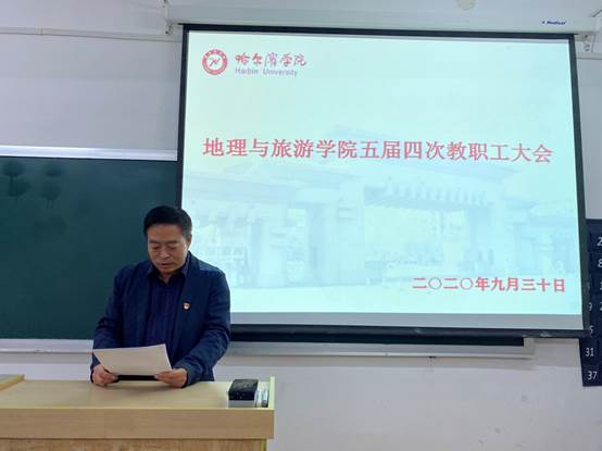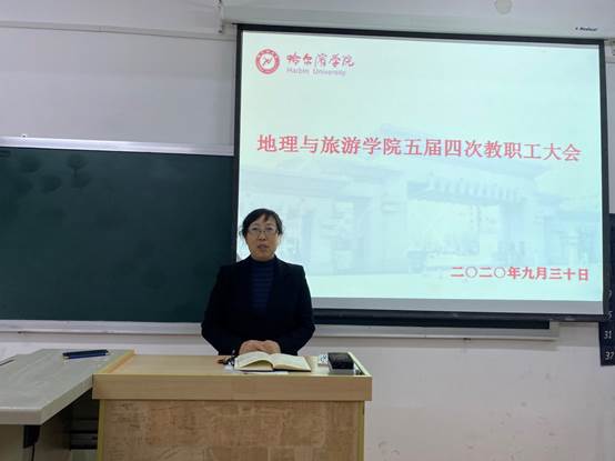 大会第一项内容,由地理与旅游学院院长于少鹏作《地理与旅游学院“十三五”发展规划工作总结及“十四五”发展规划(征求意见稿)》的报告和学院经费使用情况的说明。首先,于院长全面总结了学院在“十三五”期间取得的成绩,剖析了学院发展面临的问题和不足,重点解读了《地理与旅游学院“十四五”发展规划(征求意见稿)》,阐明学院“十四五”期间“突出应用性、突出特色性、突出工科发展、突出科技服务地方能力、突出产学研校企合作、突出全面育人”的指导原则,并阐述了人才培养、学科建设、专业建设及师资队伍建设发展规划的发展目标和重点工作纲要。再次强调学院要紧密围绕学校特色应用型本科示范高校定位与战略任务,以应用型人才培养为目标,强化为黑龙江省“生态强省”战略的科技服务能力,完善省寒区湿地生态与环境研究重点实验室、哈尔滨湿地研究院的软硬件建设,进一步强化学院特色发展与错位发展,夯实“生态牌”、“湿地牌”。最后,于院长就学院2019年度各项经费使用情况做了汇报。