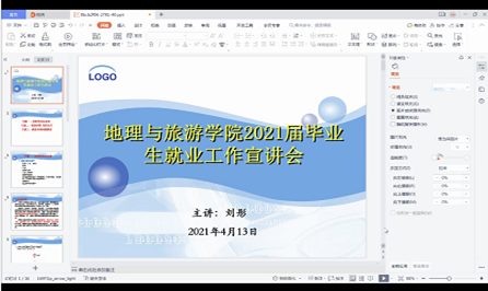 2021年4月14日19:00,地理与旅游学院在线上腾讯会议召开2021届毕业生就业工作宣讲会。全体2021届毕业生和学院就业指导老师参加此次会议。会议由学院2021届毕业班辅导员刘彤主持,副处级辅导员梁梦阳和学工办主任邢珺进行主讲。