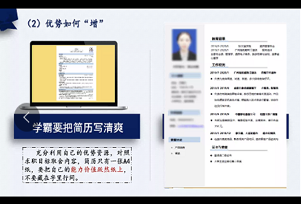 梁梦阳老师面对当前毕业生同学求职中简历制作中出现的问题,通过从求职目标决定简历内容、简历的“增”和“减”、HR眼中有价值的简历,这几个模块的详细讲解,梁老师带领同学们破解了求职的秘密,教会学生打造完美简历。