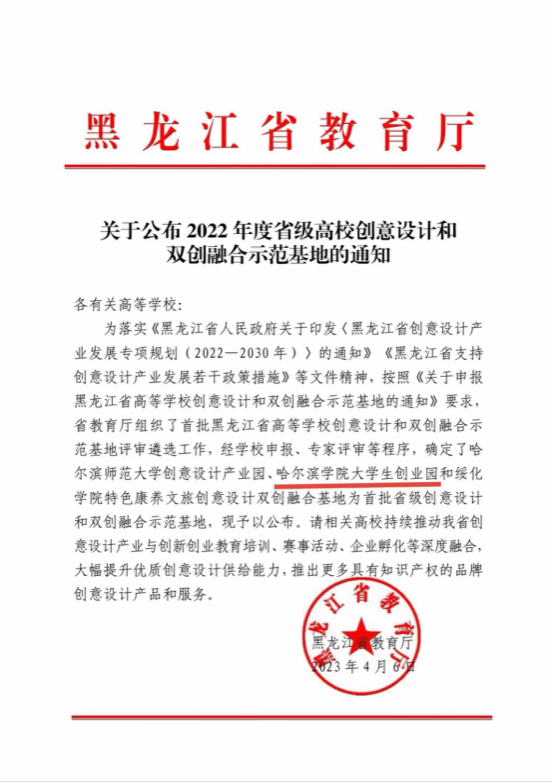 附件:《黑龙江省教育厅关于公布2022年度省级高校创意设计和双创融合示范基地的通知》