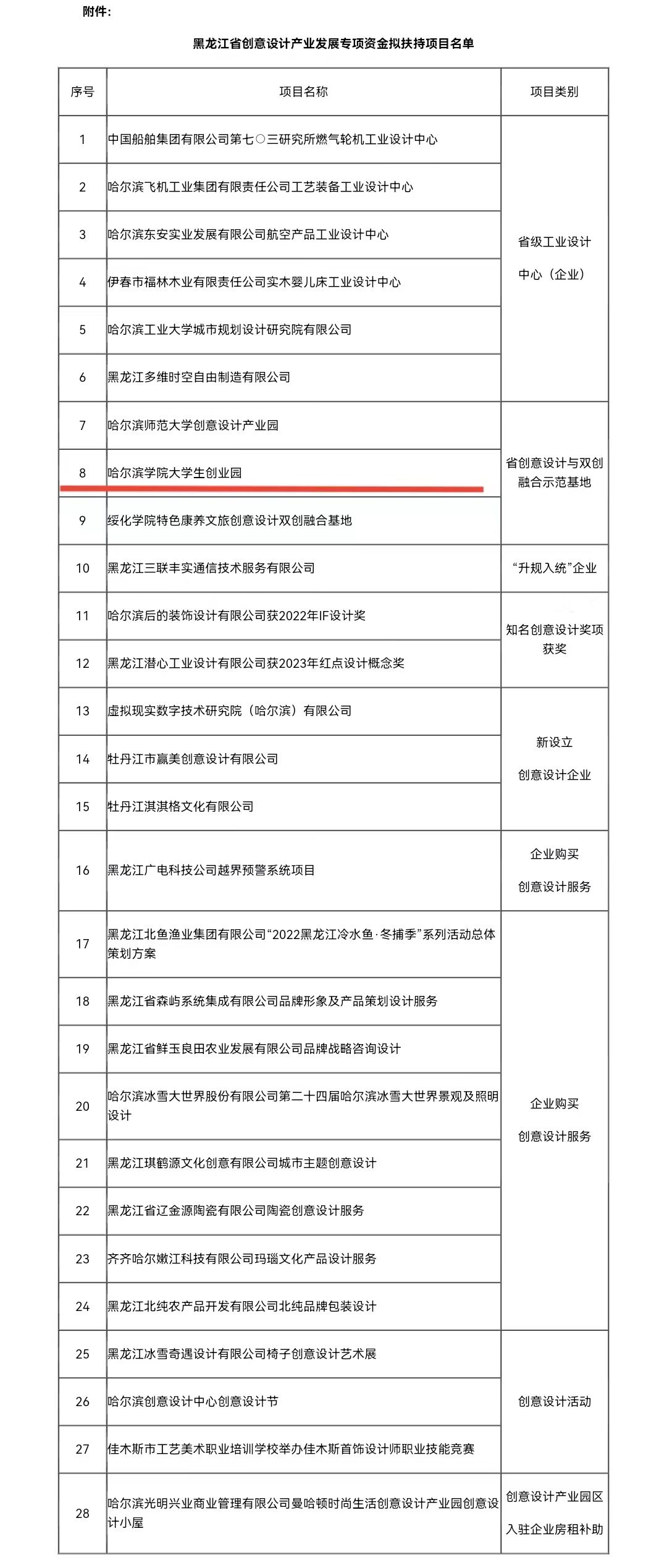 (文/李健)近日,黑龙江省创意设计产业发展工作领导小组办公室公布黑龙江省创意设计产业发展专项资金拟扶持项目名单。根据《黑龙江省支持创意设计产业发展若干政策措施》、《黑龙江省创意设计产业发展专项资金管理办法》、《黑龙江省支持创意设计产业发展政策措施操作规程(试行)》有关要求,经申报受理、材料审核、联合评审,“哈尔滨学院大学生创业园”正式获批为“黑龙江省创意设计产业发展专项资金拟扶持项目”,拟奖补资金100万元。本次获批全省创意设计产业发展专项资金拟扶持项目共有28家企事业单位,我校与哈尔滨工业大学、哈尔滨师范大学等4所高校位列其中,标志着学校创新创业教育基地建设上了一个新台阶,深化创新创业教育与创意设计专业教育的融合有了新进展。
