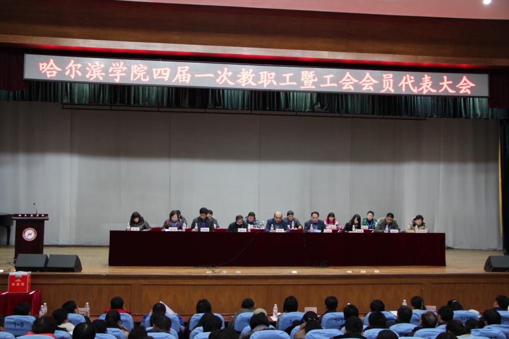 在全党深入学习贯彻党的十八届三中全会精神,扎实推进党的群众路线教育实践活动之际,哈尔滨学院教职工暨工会会员代表大会于2013年11月27日中午12:30在我校图书馆报告厅胜利召开。本次大会得到了市总工会的高度重视,市人大常委副主任、市总工会主席朴逸,市总工会助理巡视员董德泉,市总工会教科文卫体工委主任王英春等四位领导参加了会议,市人大常委副主任、市总工会主席朴逸代表市总工会致了贺词。大会由校党委书记、大会主席团执行主席孙列兵主持,校长胡永昌,校党委副书记王利民,副校长樊千分别作了《哈尔滨学院工作报告》,《哈尔滨学院工会工作报告》和《哈尔滨学院财务工作报告》。学校教职工代表128人,列席代表35人,特邀代表3人参加了会议。会议期间各位代表对大会议程进行了认真热烈的讨论,提出了许多宝贵意见。大会选举产生了第四届工会委员会委员、经费审查委员会委员和女职工委员会委员。大会在庄严隆重的气氛中圆满完成了会议的各项议程。