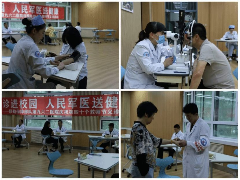 中国人民解放军联勤保障部队第九六二医院是一家具有医疗、教学、科研功能的三级甲等综合性医院。本次义诊活动派出了骨科,康复医学科(推拿),消化内科,心血管内科,血液内分泌科,神经内科,眼科,耳鼻喉科,妇产科,泌尿外科,中医科等多名的医务专家为老师们提供医疗服务、专科咨询,免费为她们测量血压、血糖,以及进行中医护理、推拿,并结合每位老师的身体状况提出相应的医疗指导和建议。