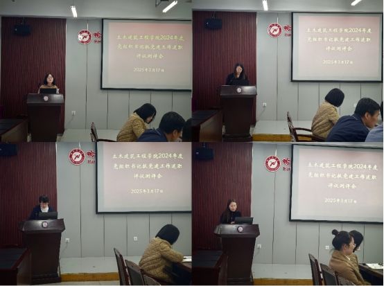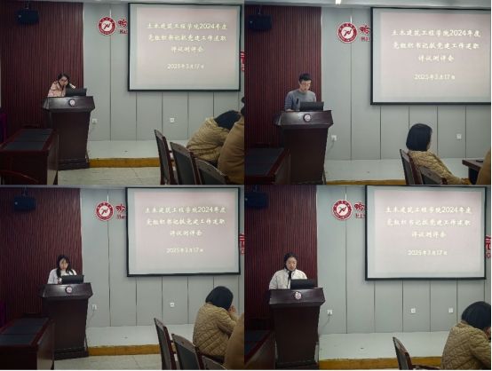 土木工程系党支部书记张田梅、城市地下空间工程系党支部书记丁宝荣、电子信息工程系党支部书记陈欣欣、建筑电气与智能化系党支部书记廖吉香、物理系党支部书记王娜娜、智能建造系党支部书记谢家斌、学生第二党支部书记艾冠霖、学生第一党支部书记张文丹先后进行述职发言。