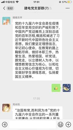 按照学院党委部署,11月15日,建电党支部组织全体党员学习了党的十九届六中全会精神,深刻认识红色政权来之不易、新中国来之不易、中国特色社会主义来之不易,增强我们继续前进的勇气和力量。党员教师们积极发表了自己的学习心得体会。