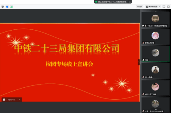 中铁二十三局招聘主管田蕊播放了宣传视频,并对公司的待遇福利、企业规模与文化、现有的产业结构、组织结构、晋升渠道等方面做了详细介绍。鼓励同学们积极投递简历,参与招聘。