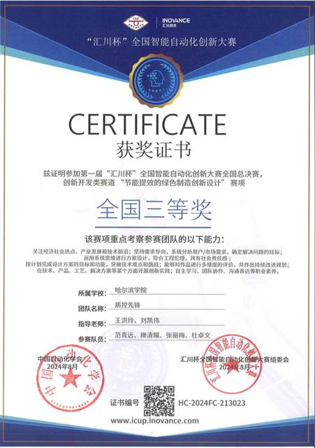 8月2日-4日,首届“汇川杯”全国智能自动化创新大赛总决赛在苏州举行,来自全国83所学校的98个团队齐聚太湖之滨,在炎炎夏日的热烈氛围中,展开了一场技术与智慧的双重较量。大赛以赛事推动创新,聚焦机器人、AI、双碳等生产力核心赛道,更深度融合教育链、创新链、产业链、人才链,联合多方资源,实现“赛育结合、奖岗贯通”,成为首个倡导“四链一体”概念的全国性自动化赛事。我院刘凯伟和王洪玲老师带队的“基于天然气压差发电的减排智控”项目在全国总决赛中获得全国三等奖。
