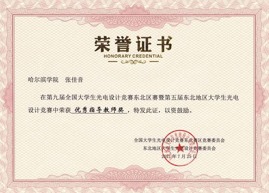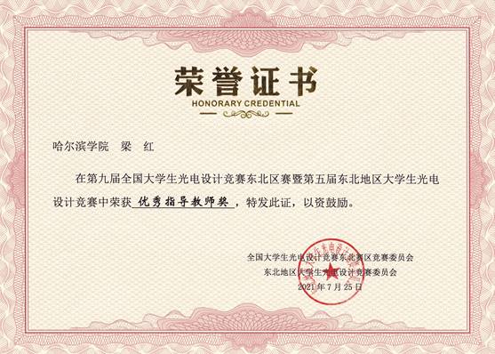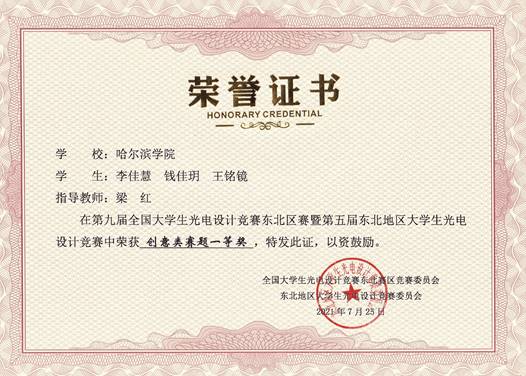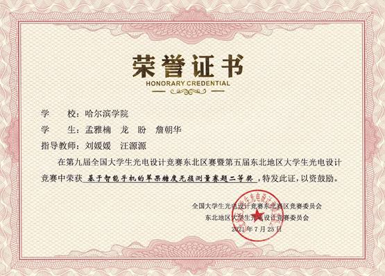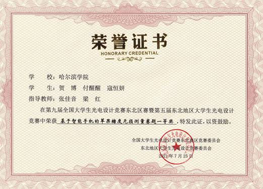 本次全国大学生光电设计竞赛东北区赛自2021年5月启动以来,吸引了来自东北赛区的包括哈尔滨工业大学、大连理工大学、吉林大学、东北大学、哈尔滨工程大学、东北师范大学、哈尔滨理工大学、哈尔滨师范大学等在内的36所学校、753支团队、共计4185名师生参加比赛。我院物理学专业教师指导物理学专业、土木工程专业、城市地下空间专业、建筑电气与智能化专业、电子信息工程专业学生获得东北区赛一等奖2项、二等奖1项,黑龙江省赛一等奖4项、二等奖2项。其中,东北区赛,物理学专业学生贺博、付醒醒、寇恒妍获得“基于智能手机的苹果糖度无损测量”赛题一等奖,李佳慧、钱佳玥、王铭镜获得创意类赛题一等奖,孟雅楠、龙盼、詹朝华获得获得“基于智能手机的苹果糖度无损测量”赛题二等奖,三支队伍同时获得了省赛一等奖。同时,由土木工程专业蔡田丰、城市地下空间工程专业杨开宇、陈少华组成的代表队获得了省赛创意类一等奖,由土木工程专业学生张文岗、建筑电气与智能化专业学生梁申博、霍钫琦组成的队伍获得了省赛创意类二等奖,由建筑电气与智能化专业王伊洋、物理学专业张瑶、电子信息工程专业谭晨组成的队伍获得了省赛创意类二等奖。张佳音、梁红两位老师获得东北区赛优秀指导教师称号。