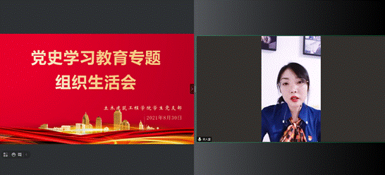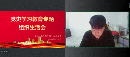 8月30日18时,学生第一党支部书记张阳、学生第二党支部书记荣人慧在腾讯会议平台召开了党史学习教育专题组织生活会,学工办主任胡海兰、支部委员鄂睿峰、艾冠霖、曹禹以及全体学生党员、预备党员参加了本次会议。