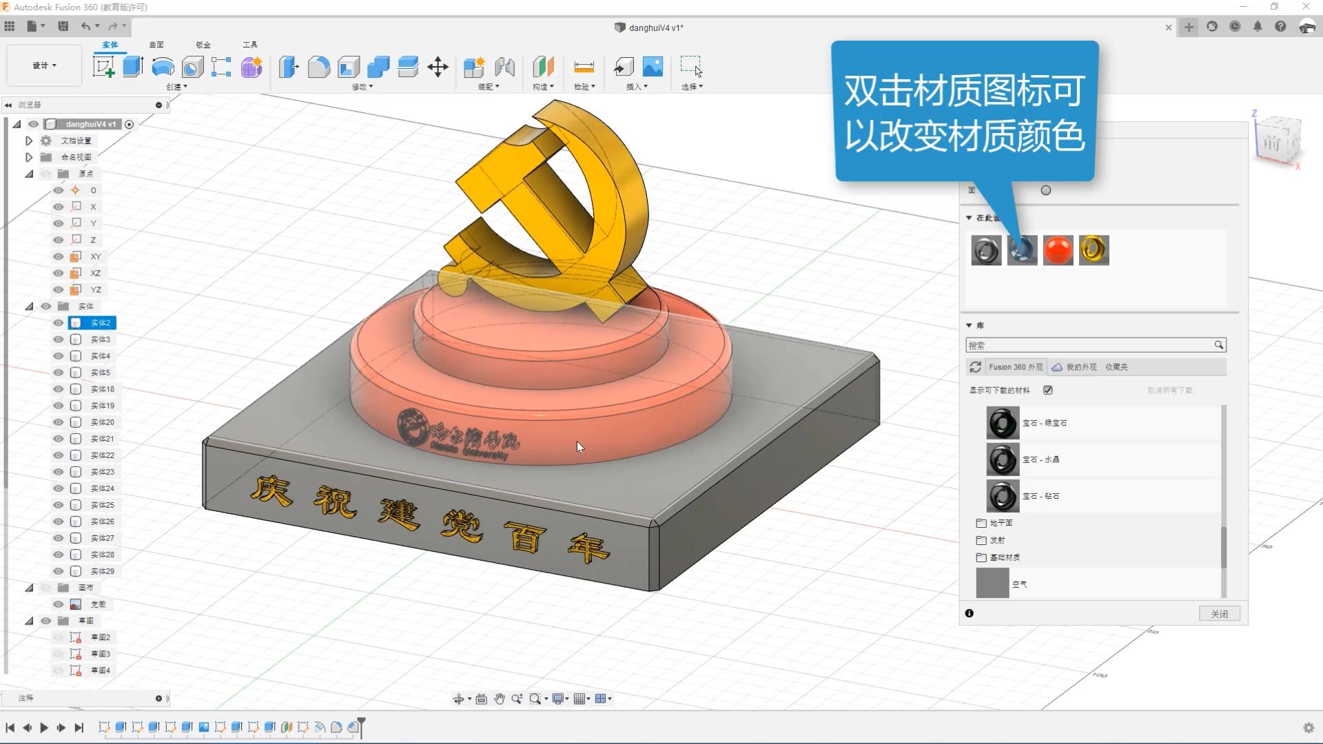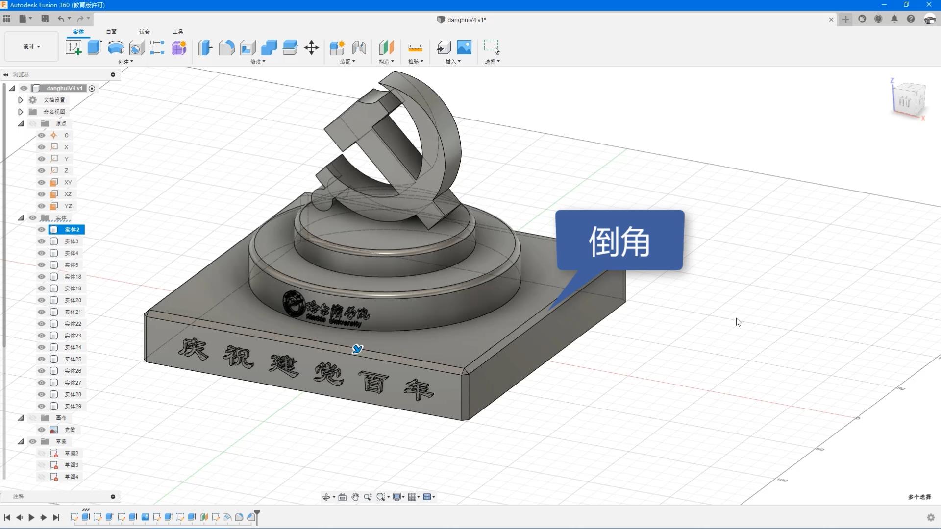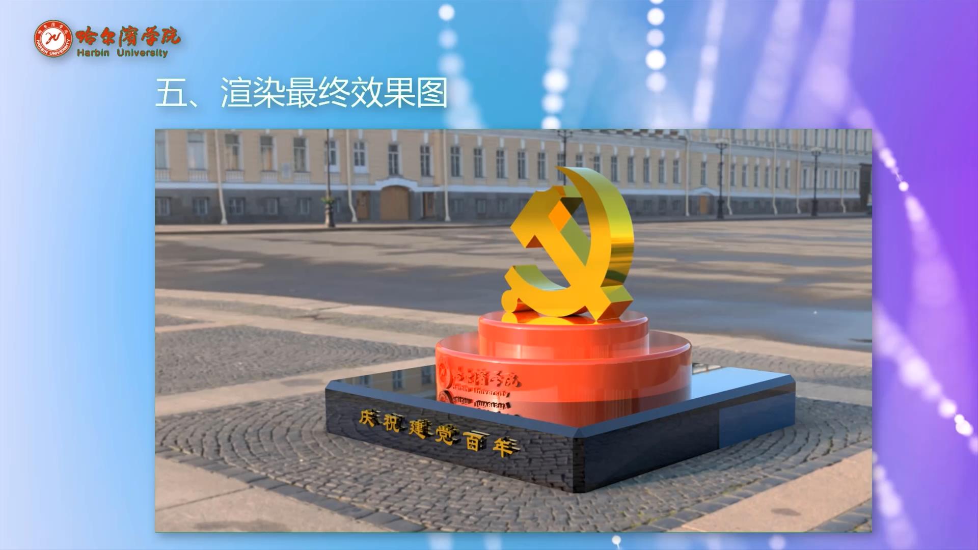 该作品以“数字化创意设计——庆祝建党百年”为主题,结合当下最新、最受学生关注的事件,调动学生的专注力,融入思政。以庆祝建党百年为契机,以党徽为教学案例,利用微课优势,在特殊注意点加注标识提醒,实时演示产品设计制作及后期渲染全过程。培养学生对3D打印等前沿科学的兴趣和认识,提升学生对创新技术和工具的使用技能,进而达到培养学生爱国爱党情怀,提高学生创新创意意识的教学目标。