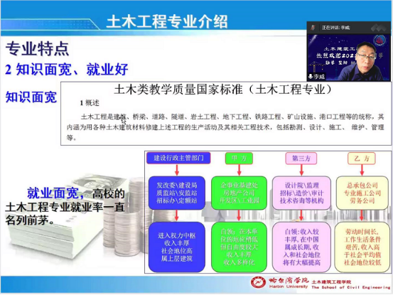 李威主任进行了土木工程专业介绍,土木工程专业历史悠久,是学校“土木专业集群+创新创业人才培养试验区”重点建设专业,经过多年发展,先后行生了多个新兴专业。本专业设有建筑工程、交通土建2个专业方向。专业历史修久,师资精良,同时拥有市级领军人才梯队及省级优秀教学团队,其中高级职称和博士学位专任教师人数占比超过半数,在职教师均为具有企业工作经历、工程实践背景或国家注册工程师执业资格的“双师型”教师。本专业拥有两门省级精品课程,近年来,分别获得国家自然科学基金项目及黑龙江省自然科学基金项目立项,拥有12个大类36个专业实验室,总使用面积4100平方米,仪器设备总值近3000万元,具有良好的专业实验实践教学及科研条件。