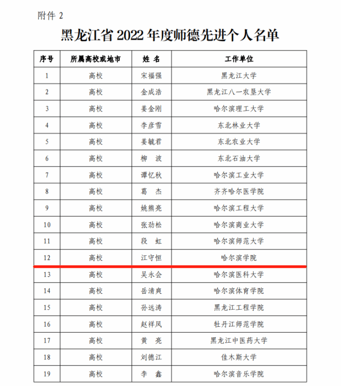 (文/邢珺)近日,省教育厅印发《关于表彰2022年度全省师德先进集体和师德先进个人的决定》,我校江守恒教授被授予“黑龙江省2022年度师德先进个人”荣誉称号。