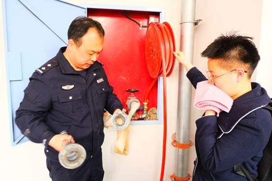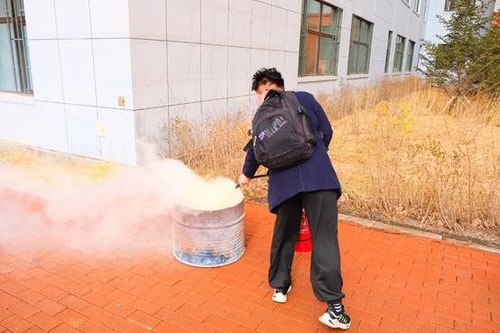 现场师生进行了消防撤离演练。刘震逐一演示了如何正确使用二氧化碳灭火器和干粉灭火器,以及消火栓和水带的使用方法以及注意事项。随后现场师生进行了实际操作。