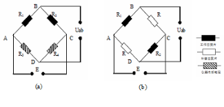 测量电桥可直接采用半桥单臂方式测出R1和R2受力产生的应变值ε1和ε2;也可采用邻臂桥路接法可直接测出弯矩引起的应变(ε1-ε2),(采用此接桥方式不需温度补偿片,接线如图2(a));采用对臂桥路接法可直接测出轴向力引起的应变(ε1+ε2),(采用此接桥方式需加温度补偿片,接线如图2(b))。