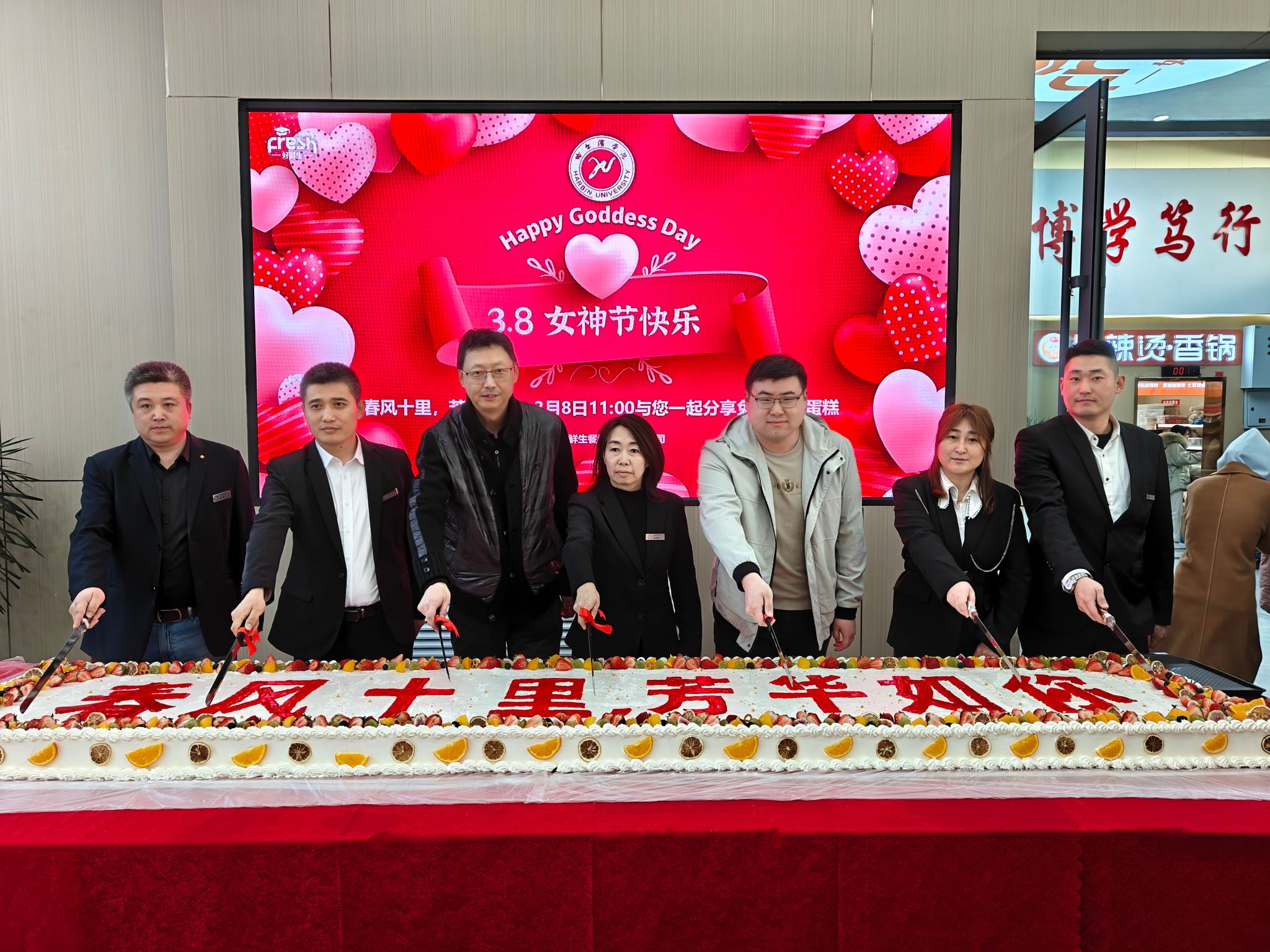 3月8日上午,食堂大厅内人头攒动,欢声笑语不断。巨型蛋糕惊艳亮相,蛋糕表面点缀着缤纷的水果,并写着“春风十里,芳华如你”的主题字样,瞬间吸引了众多师生的目光,同学们纷纷拿出手机拍照留念,记录下这温馨美好的时刻。